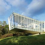 A steel frame and a massive concrete foundation provide the heft that enables the cantilever’s featherweight, floating look.