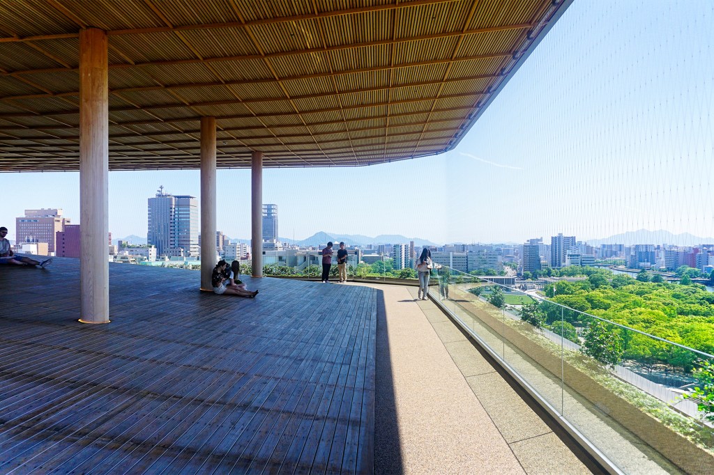 The shaded open-air space becomes, in effect, a large wind- and light-funnel, constantly pulling in gentle breezes rather than the intermittent gusts that would occur if the observatory were glazed or roofless. The angled floor and ceiling greatly increase views of the surroundings, which include the adjacent Genbaku Dome and its previously ravaged context, as well as the city skyline and surrounding mountains.