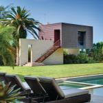 Like a backward Cubist comma, a Florida guest house appears to float above the lawn.