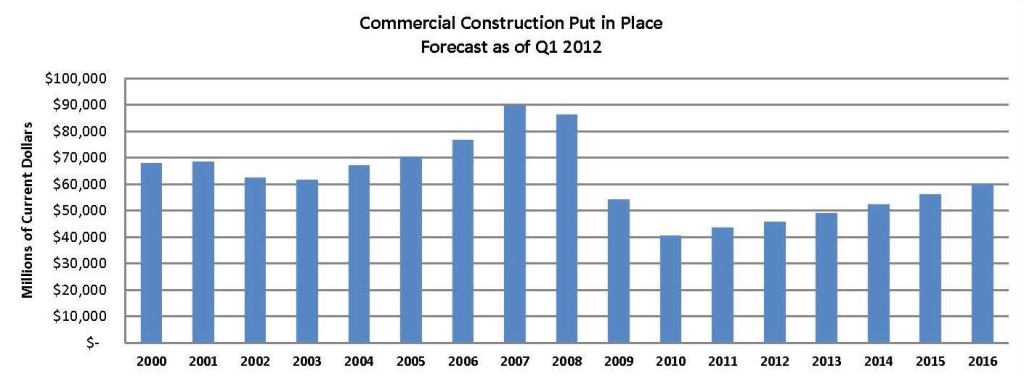 While consumers are coming back to the marketplace in fits and starts, many factors beyond the growing competition from e-commerce inhibit the addition of new retail space. Significant shifts in demographics and spending power may play a role; for example, younger people may hold fewer stable jobs, postpone parenthood, and move into urban multifamily housing. Although our forecast does expect commercial construction will grow another 5 percent in 2012 and then another 8 percent in 2013, to reach approximately $49.1 billion—$9 billion more than 2010 figures—commercial Construction Put in Place is still working its way back to the rate we saw in the mid-1990s.