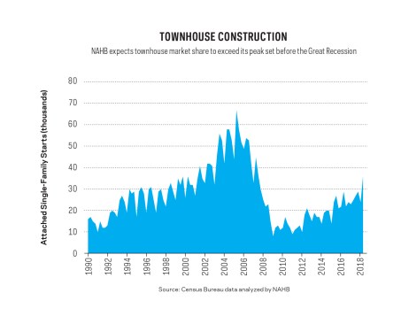 Recent Census Bureau data, as analyzed by the NAHB Economics team, indicates this market is expanding in terms of counts of units and market share. In the second quarter of 2018, 36,000 townhouses started construction.