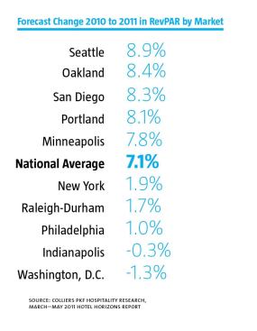 The recovery, which is already under way, is characterized by increased demand and a rebound in revenue per available room (RevPAR). In 2010, RevPAR jumped by 5.5 percent, according to the March–May 2011 Horizons Report from Colliers PKF Hospitality Research. The same report forecasts that U.S. hotels should achieve a 7.1 percent increase in RevPAR and lodging accommodation demand should increase by 4 percent in 2011.