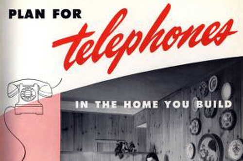 Modern homes should be “telephone planned,” this document declares in its opening statement. The sample plan indicates more than a dozen locations in a typical ranch house for the installation of phone jacks.
