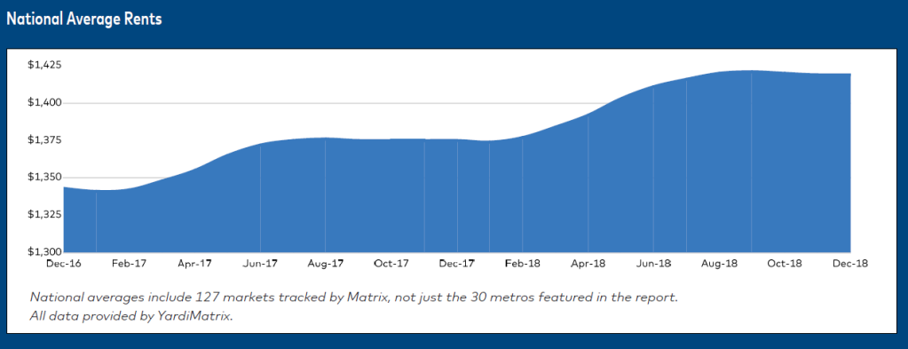 The national multifamily rent remained at $1,419 in December, according to the latest Matrix Monthly report by Yardi Matrix, while year-over-year (YOY) rent growth stayed flat, at 3.2%, unchanged from November 2018.