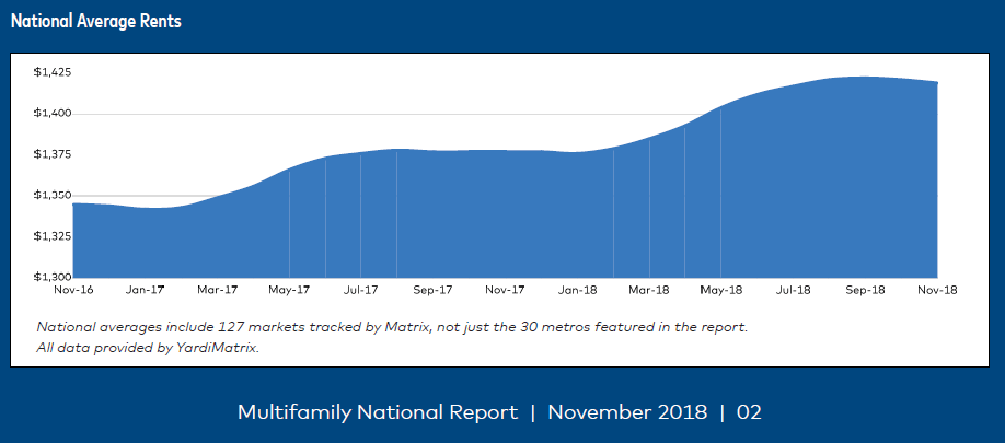 U.S. multifamily rents fell by $2 in November, down to a national average of $1,419, according to the latest Matrix Monthly report by Yardi Matrix. Year-over-year (YOY) rent growth fell by 10 basis points (bps) at the same time, down to 3.1%.