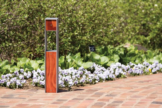 A slim, aluminum frame and wood accents pair in this 4″-by-4″-base LED pathlight, which can be specified with a 4W LED in 2750K for marker and pedestrian models and in 3000K for dual- and single-sided versions. The anchor base and mounting hardware are concealed, and a welded-in baseplate attaches to the ground using a concrete bolt kit or earth spike. The fixture is ADA compliant. structura.com
