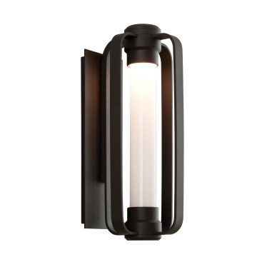An opal or seeded glass diffuser is capped with bronze-finished aluminum and brass while connecting bands bridge the two and surround the source. It is lamped with a single, 12W LED in 2700K with a CRI of 90 delivering 840 lumens and has 120V incandescent dimming. The fixture is 20″ tall by 8.5″ wide with a 17.25″ tall by 5.75″ wide by 1″ deep backplate. It is California Title 24 compliant. troy-lighting.com