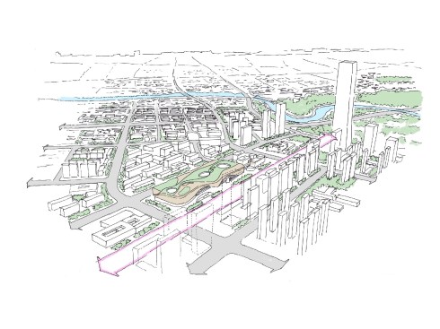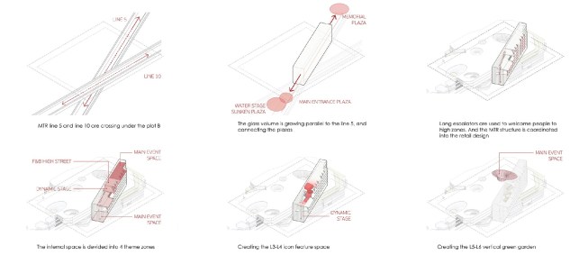 The initial scheme envisions three interconnecting buildings linked by a sunken street, incorporating office, retail, and cultural spaces. Adjacent to a Chinese history museum on one side and a shopping mall on the other, this mixed use project will run parallel to the remaining runway, which has been kept in its original form as a historic feature.