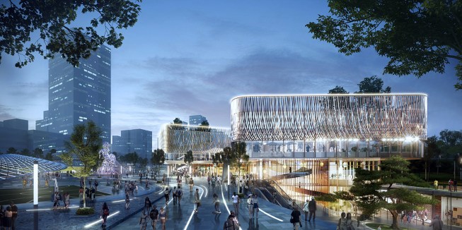 “The design unifies two distinct habitat: the urban high-rise and the human scale parkland. This results in a built environment that offers the best of the surrounding context as a sustainable, green, natural and human scaled place with the accessibility, activity, and flexible public realm that dynamic urban spaces should provide. A Social Promenade organises the site’s circulation weaving from the parkside metro to the adjacent mixed use development of Joy City. The Promenade structures an immersive urban park blending retail, entertainment, flowering meadows, tree groves, a multi-purpose outdoor amphitheater, sports courts, community spaces, and fitness stations along this new district thoroughfare.”