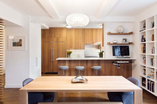 Located in the historic gardens of Forest Hills, NY, this clean modern interior renovation converts a spacious 2-bedroom into a 3-bedroom with a flexible home office. In early discussions, a small request for an ‘outlet for a laptop near the bed’ quickly evolved into realizing that our client’s work involved all hours of the day. We created a flexible, glass enclosed office space which became central to the spatial organization, acting as a buffer between the open living/dining areas and the more private bedrooms while allowing full access during day or night. A teak slat screen clads the office, allowing for natural light and filtered sight lines. The existing dark, narrow galley kitchen was opened up and completed with modern teak cabinetry with integrated appliances. Two bedrooms are adjoined with a large sliding pocket door, converting the children’s’ bedrooms into a playroom. Built-in cabinetry was carefully detailed throughout the apartment, optimizing much needed storage.
