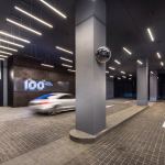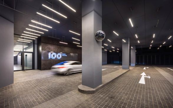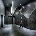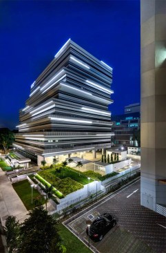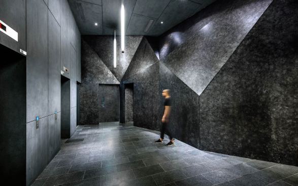 The facade comprises windows, balconies and air-condition ledges, but we intentionally blurred the definition of each element by layering a series of horizontal stripes throughout the facade. The stripes generate horizontal visual movement across the building and emphasize the “shifting and stacked” nature of the different volumes. A palette of varying grays is employed to generate the variety of tones required for the “horizontal banding”. This horizontal striping is also applied consistently to the landscape and hardscape elements surrounding the building. The interior experience celebrates a stylized industrial aesthetic through the bold use of feature lighting, materials and environmental graphics across the different floors. Key interior spaces include the lift lobbies and passenger drop off point and the building also boasts a roof top garden space overlooking the sea.