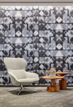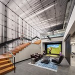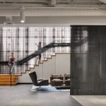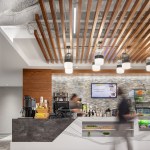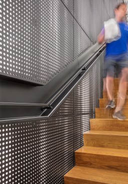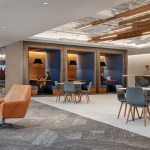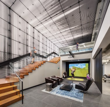 For tenants looking to be active during the work day, the 10th and 11th amenity floors feature a newly renovated and expanded fitness center with a steam room, yoga studio, golf simulator, and shuffleboard. The 11th floor hosts a large, Wi-Fi-enabled tenant lounge and coffee bar designed with oversized pendant lighting, custom-made built-in banquettes, and an exposed wood ceiling, delivering an urban chic design aesthetic. To craft a balance with the industrial elements, materials such as high-gloss metal surfaces are paired with warm wood accents to create texture and a sophisticated, yet comfortable atmosphere. SCB designed an interconnecting stair that adds visual interest and an openness to the space, and also facilitates interaction between the two floors.