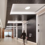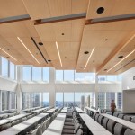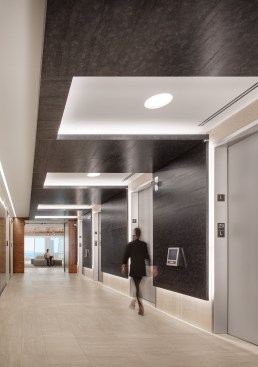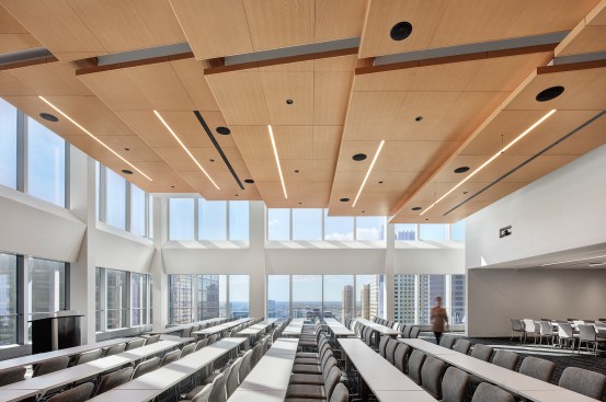 One of the most prominent design features on the 29th floor is a 400-seat double-height conference space designed to be divisible by a sky-fold partition, offering a large amount of pre-function space. The thoughtful selection of back-lit perforated ceiling panels creates soft lighting and is inspired by the city lights at night. Inside the conference space, stepped wall panels with cove lighting celebrates the high ceilings and creates visual motion and a dramatic impact. During the warmer months, tenants can take advantage of an outdoor terrace with comfortable