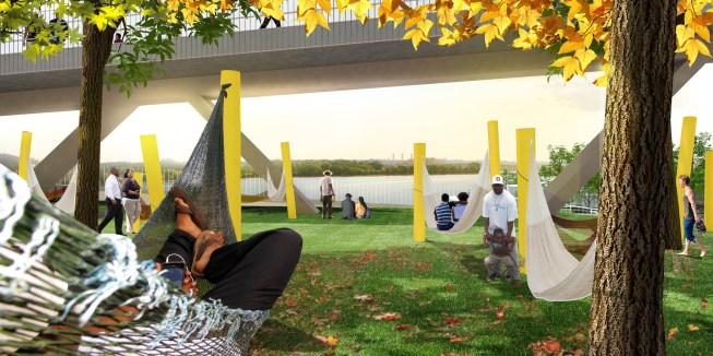 2014–Our design for the 11th Street Bridge Park—the Anacostia Crossing—is a place of exchange. The park at Anacostia Crossing will connect two historically disparate sides of the river with a series of outdoor programmed spaces and active zones that will provide an engaging place hovering above, yet anchored in, the Anacostia River. To create this place—more destination than elevated thoroughfare—we have designed the bridge park as a clear moment of intersection where two sides of the river converge and coexist. Anacostia Crossing will offer layered programs, presenting a new neighborhood park, an after-hours destination for the nearby workforce, a retreat for residents and a territory for tourists to explore.
