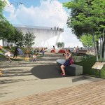 The paths also form elevated platforms on a 5% slope with views to the Anacostia River, the activities on the bridge, and prominent landmarks within Washington, D.C. and Anacostia. These platforms simultaneously provide shade and shelter for the café on the southeast side and the performance space and hammock grove on the northwest side. At each side, a waterfall marks their terminus and reconnects them to the river below . On the east side, this waterfall is linked to an active filtration system that—together with new wetland areas adjacent to the bridge piers—works to actively clean the river around the Anacostia Crossing.