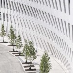 Curved around the street on ground level, 1200 Intrepid’s front façade is created by the strategic stacking of High Concrete’s precast panels of varying sizes, figured in a basket-weave pattern to realize the top of the building’s straight edge. As the panels reach upward they also tilt outward, creating an inviting, cave-like canopy over the building’s front sidewalk. Each of the building’s other three sides stand straight up, maintaining the structure’s signature paneling.