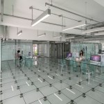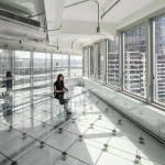 With floor area at a premium in Hong Kong MVRDV aimed to create an office space which offered maximum attractiveness and perceived spaciousness in order to provide as pleasant working environment as possible. The building is stripped down to its beautifully raw and butch primary structure, with all unnecessary trimmings being taken out. Infill was only then added to the building in the form of white paint, glass and stainless steel in order to maintain and highlight the purity of the bare structure. Old and new are easily distinguished, whilst the inner workings of the building are on display for all to see. But how to create an office environment that also brings with it the purity and simplicity of the building design? The answer, glass tables, shelves, floors, speakers, computers, walls – an entirely glass office, free from visible clutter. The model office stands as an example for tenants to install in their work spaces if they desire.
