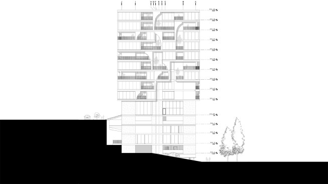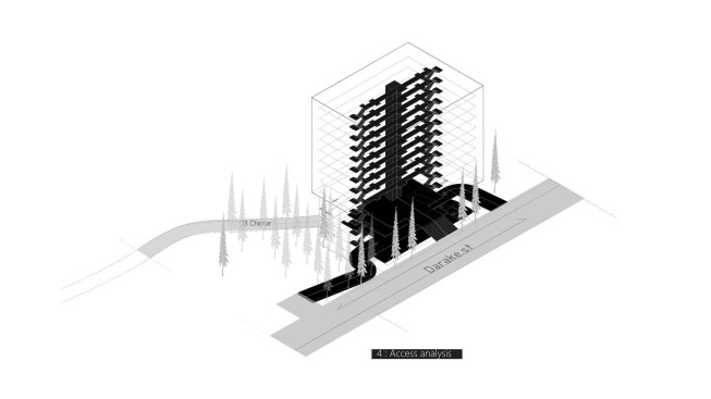The 13Chenar residential project referred to us when the construction process was suspended due to the client dissatisfaction. The building was designed by bubble deck system which liberates the interior from structural elements and moved them toward the edges of slabs. They just finished the fourth slab when they asked us to revise their project. We refused to design just a simple facade and proposed a serious set of changes both in architecture and facade. Because of the imposed structural system limitation in making hollows, we decided to focus on the edges of the building and define a hierarchy from outside in. In order to do so, we designed all the units requirements in the space between the core and the shear walls and considered the legal console area as a different kind of space. So we applied our layer concept to this added area. The layer concept consists of curtain wall, vault abstraction, window and shear walls respectively from outside in. All of those elements are placed on the 1.4m depth cantilever slab.