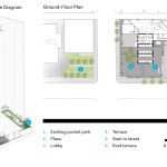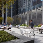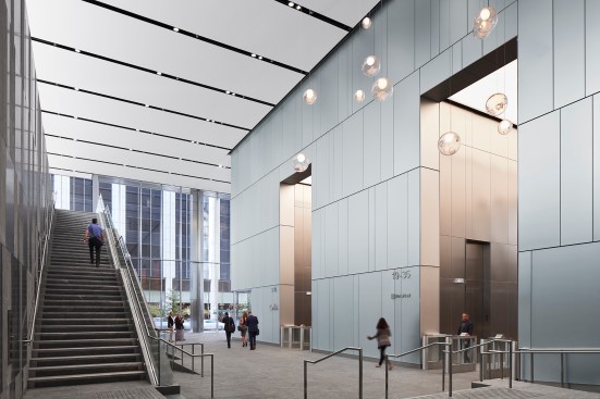 Ronan’s approach to creating flexible urban space isn’t limited to the outdoors, it extends to the lobby as well. Security at the elevator cores limits upper-floor access to tenants, but the majority of the space remains publicly accessible. “It feels like a grand lobby,” Ronan says, “but at the same time there are spaces within the lobby that feel smaller and more intimate—like a sunken lounge.”
