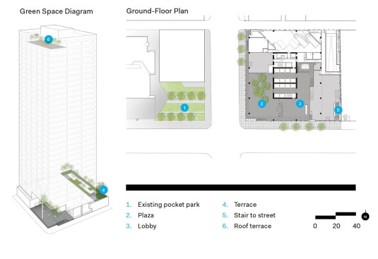 The second-floor terrace feels more private, though it is open to the public via an exterior stair leading directly to the street. “It gets direct sunlight from 11:00 to 1:00,” Ronan says, “and at other times it’s shady and contemplative.” The tenants-only roof terrace is lined with glass walls that serve as a windbreak. It can accommodate large gatherings, but hawthorn trees in gabion planters define smaller seating areas. Placing a deck at the top of the tower was a pointed choice: At 36 stories, the tower is shorter than the buildings around it, so, Ronan says, “How much sense does it make to spend the money on a form at the top of the tower?” Instead, the terrace draws the street plaza into the skyline.