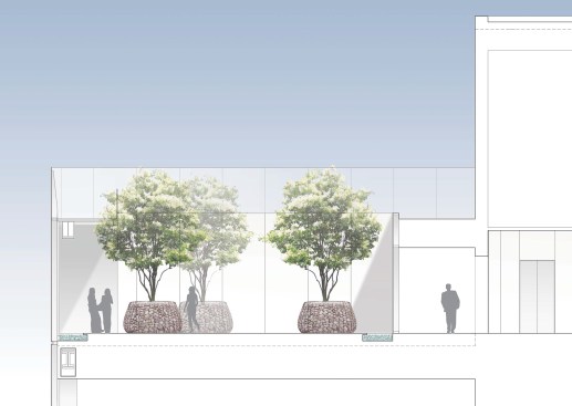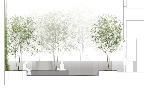 The plaza is carved out of the base of the tower, behind a colonnade, and features a scattering of birch trees and seating for a ground-floor café. The branches and leaves are hazily reflected in the linen-finished stainless steel ceiling panels two stories above, so that “the effect of the trees is amplified,” Ronan says.