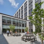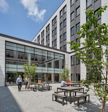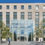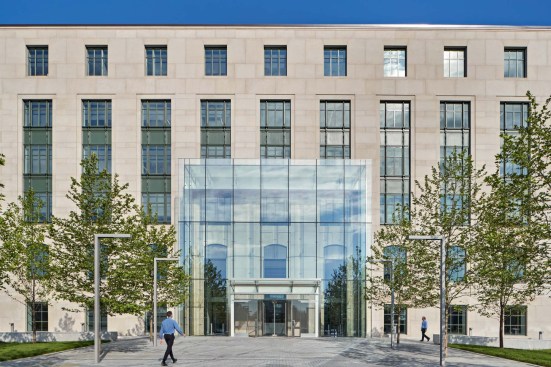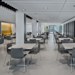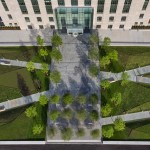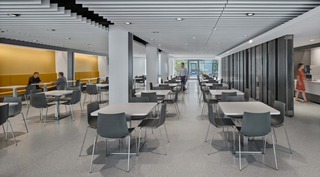 A new two-story glass curtain wall defines a grand, new, accessible public entrance, providing transparency into the lobby with lines of sight extending through two additional glass walls opening to the building’s courtyards. The front of the building was shifted from north to east to use the site’s natural slope for accessibility. The courtyards — once inaccessible from the ground floor—were raised 6 feet. They now open to the cafeteria and meeting rooms at ground level, allowing for outdoor dining and indoor/outdoor meetings.