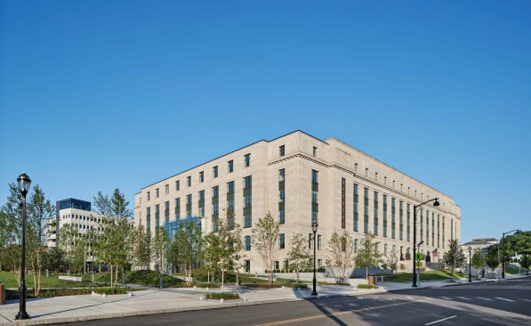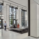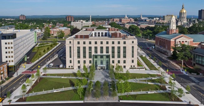 Visitors approach the SOB through a one-acre park—the first new greenspace in Hartford’s core in over 50 years—walking on two-toned granite pavers, laid to scale in the pattern of the Connecticut River, which is visible from many of the building’s windows. The classic limestone exterior was preserved and liberated from 370 window unit air conditioners that were replaced with high efficiency heating and cooling systems.