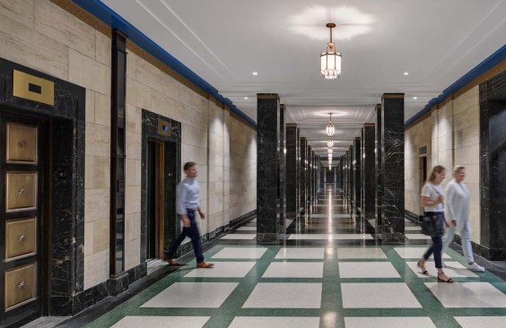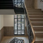 The main entrance leads to a new double-height lobby characterized by marble walls, a grand stair connecting the two levels, and a bridge across the upper level. The lobby now matches the scale and grandeur of the building’s exterior (previously, much of the ground floor was occupied by offices). Other existing spaces with a great deal of character, including the historic hall and main staircases featuring ornamental flourishes such as coffered plaster ceilings, marble colonnades, brass gates, and mail chutes, were faithfully restored to their original condition.