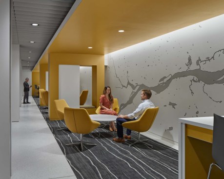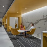The rest of the SOB’s former labyrinthine interior, (“It was a rabbit warren. It was offices, within offices, within offices,” Carol O’Shea, Connecticut’s facilities planning manager, told The Hartford Courant) was demolished. Workplaces designed specifically for the agencies that occupy them and their particular balance of focus work and collaboration now fill the seven-story, 350,000-square-foot office. High ceilings and exposed duct work lend a contemporary feel to the civic building with nods to its history when suitable such as exposing the original terra cotta floor formwork and brick walls where possible. To facilitate wayfinding, floors within are branded by compass points, with each of the four building sides distinguished by different color accents.