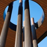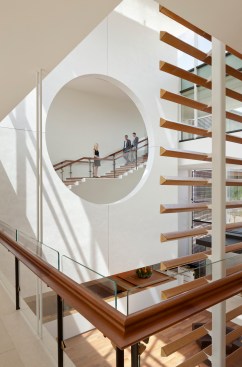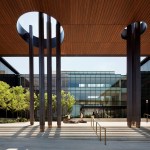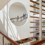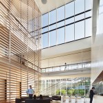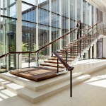 KPF’s strategy cut the central third out of the existing building to create a series of open-air courtyards. The central courtyard divides the building into two parallel office bars, or wings, whose ends face the parking space. A central connector, the lobby space, is conceived of as an architectural promenade leading to the third floor by way of an ornamental stair sequence.