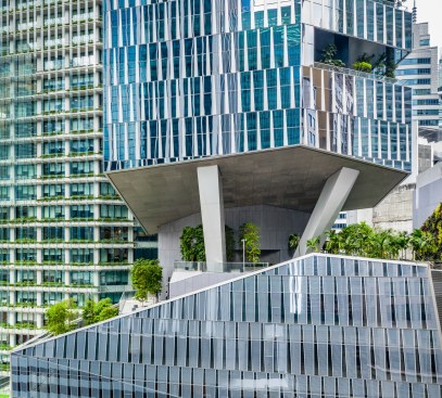 The podium features a similarly faceted vocabulary combined with a reduced scale and materiality that form a contextual relationship with the angular roof form and terracotta of Lau Pa Sat. The podium is elevated above the street, enhancing the spaciousness and continuity from the ground level entrance into the atrium garden. The atrium forms the nucleus around which the office lobby, retail and F&B are organized. Urban windows facing Robinson Road expose retailors and internal activity.
