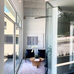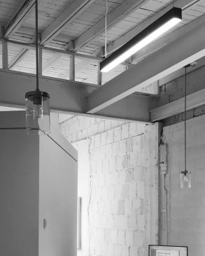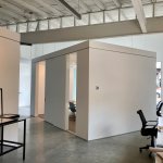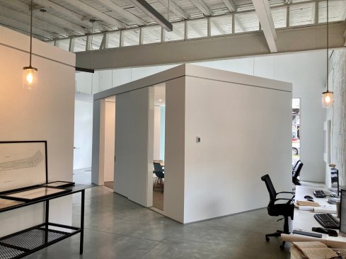 The architectural concept is to contrast the roughness of these materials against finely detailed floating pods in the interior. The pods contain rooms that never touch the walls or ceiling of the shell. One is a service pod with a kitchen and bathroom, and the other is a place for meetings. The meeting pod is askew to create reception, waiting, and work spaces.