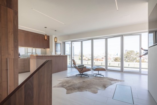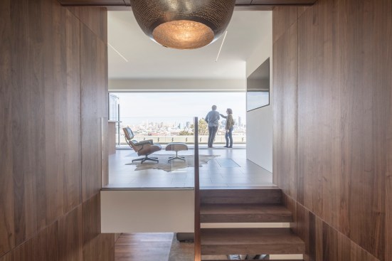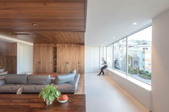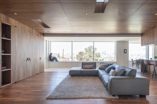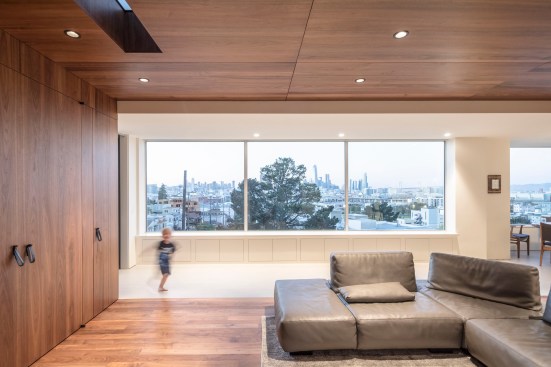 Sidell Pakravan Architects has renovated an apartment in San Francisco’s Potrero Hill by contrasting a set of distinct wood volumes against the dominant horizontal planes of existing low ceiling heights and making use of an unused roof to capture outdoor space within the city.