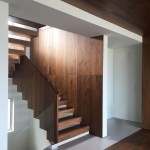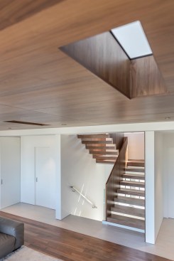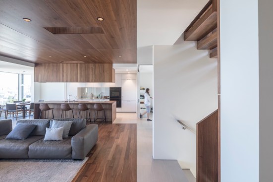 The volumes, clad in walnut, establish a warm visual language that continues from the main floor through to a new penthouse. One volume controls vertical movement through the space, while a second defines the main living area and breaks through the ceiling to create a large interior room on the roof. The reading of the two volumes registers as a material difference between the insertions and the surrounding perimeter. A deep built-in bookcase on one edge and a solid wood island on the other edge emphasizes the volumes’ figural, rather than planar, quality.
