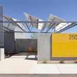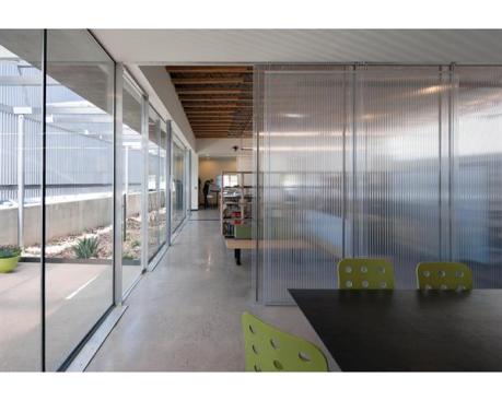 On the plus side, the building had a large circular driveway—a remnant of the restaurant’s drive-thru—but it had undesirable west-facing glazing that had to be addressed. The firm gutted the building and created a landscaped entry courtyard and screen system to prevent heat gain. A large open plan in the front houses the studio and a 1,100-square-foot addition in back is reserved for the garage and workshop. Interiors are straightforward, with concrete floors, exposed roof trusses, and gypsum walls.