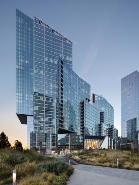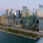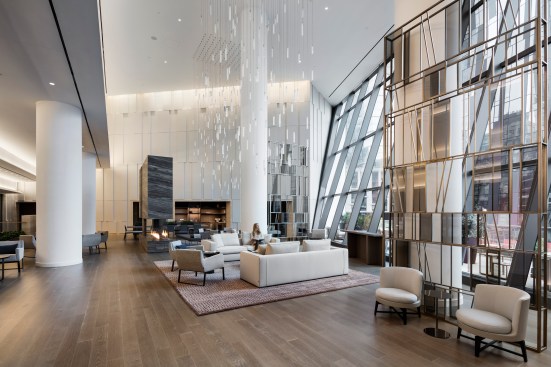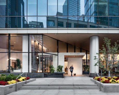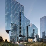 To avoid an overwhelming “superblock” scale, the massing of the building is broken down. The two towers are connected by staggered volumes with multiple corners to bring light and air to all the units. The central lobby further breaks down the building’s scale by opening up the podium to take full advantage of the park to the south and pull additional daylight into the building.