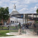 Sejima and Nishizawa have created a stunning Pavilion that resembles a reflective cloud or a floating pool of water, sitting atop a series of delicate columns. The metal roof structure varies in height, wrapping itself around the trees in the park, reaching up towards the sky and sweeping down almost to the ground in various places. Open and ephemeral in structure, its reflective materials make it sit seamlessly within the natural environment, reflecting both the park and sky around it.