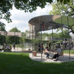 Describing their structure the architects said: ‘The Pavilion is floating aluminium, drifting freely between the trees like smoke. Its appearance changes according to the weather, allowing it to melt into the surroundings. It works as a field of activity with no walls, allowing uninterrupted view across the park and encouraging access from all sides.’