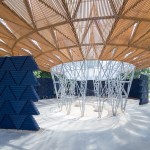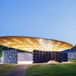 Fundamental to my architecture is a sense of openness. In the Pavilion this is achieved by the wall system, which is comprised of prefabricated wooden blocks assembled into triangular modules with slight gaps, or apertures, between them. This gives a lightness and transparency to the building enclosure. The composition of the curved walls is split into four elements, creating four different access points to the Pavilion. Detached from the roof canopy, these elements allow air to circulate freely throughout.