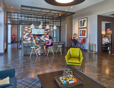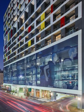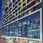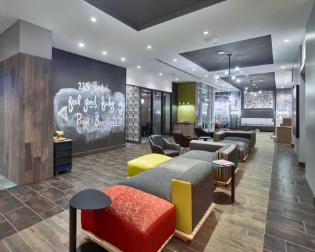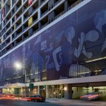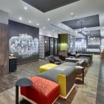 The renovation included a complete re-skin of the building and a full gut of the interiors down to the structure. The new space brings 348 market-rate apartment rental units consisting of studios, junior one-bedrooms, one- and two-bedroom units, most with balconies. The residential amenities include a business center, leasing center, conference rooms, pet care center and covered dog walk area, fitness rooms, club room with entertainment kitchen and rooftop pool area. A portion of the ground floor level along Calvert Street will host retail.
