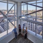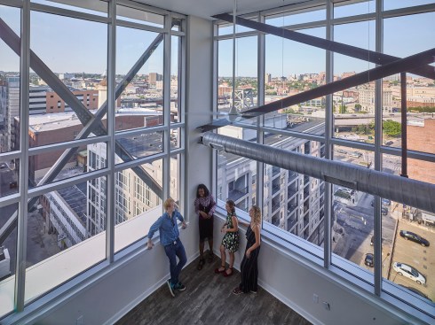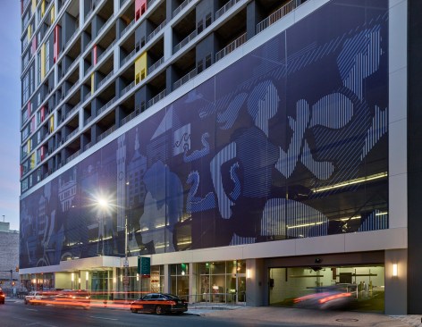 Hord Coplan Macht designed the re-use renovation of 225 North Calvert Street, a former banking center, into market-rate apartments. The 17-story building consists of 551,000 gsf of area and includes a parking garage located beneath the building. The parking garage combines below-grade and above-grade parking with a total of 445 covered parking spaces.