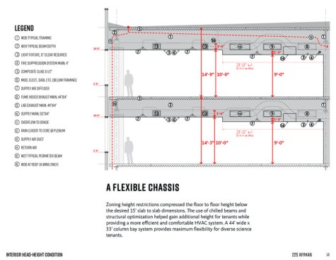This lab and office workspace is highly customizable, supporting various leasing strategies and configurations, with the capacity to accommodate up to 60% lab areas. It maximizes column-free space and natural light while maintaining controlled floor vibration, ideal for research tenants. The project team, with a forward-thinking approach, documented pathways and footprints for future tenant systems, including plans for supplemental chase and rooftop footprints to incorporate a future vivarium.