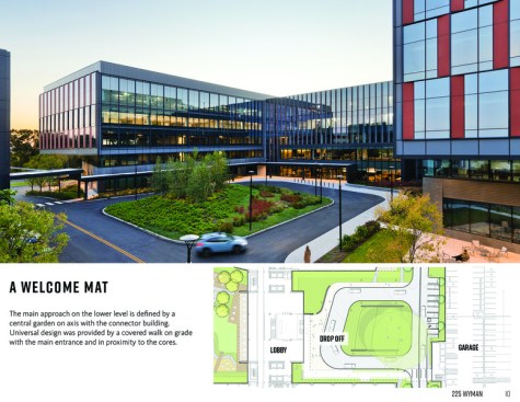 225 Wyman was conceived as a holistic workplace campus. It features amenities such as an adjacent parking garage, electric vehicle parking spaces, bike storage, showers, a fitness center, a conference center, and a kitchen/café. The campus includes a 1-acre landscaped quad and several acres of outdoor space and walking trails, reflecting the client’s commitment to health and wellness. Designed to meet the high standards of FM Global and Hobbs Brook, this building ensures exceptional safety and is built to support tenant growth and development over time.