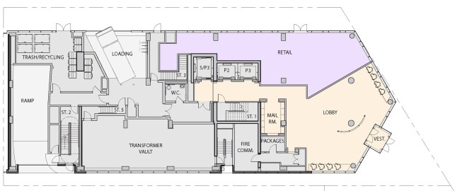 COMPONENTS: 237,000 ft2 / 22,000 m2 gross area; residential tower with entrance lobby facing a new park; some apartments with balconies; ground-floor retail; common room; fitness center with outdoor terraces