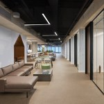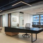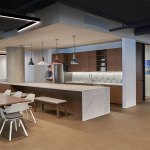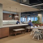 Some of the highlights include infusing the essence of the company into the space through the use of super-graphics wrapping large expanses of interior walls depicting the City of Chicago from the vantage point of the river. We’re also reinforcing the company’s relationship to the river through the repeating sawtooth glass enclosure for the office fronts, with a layering of interior landscaping.