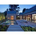 The starting point for this project is small house at 308 Mulberry Street, originally constructed in the early nineteenth-century in the heart of the historical district of Lewes. In the redesign, the exterior of the original structure is meticulously restored. A shed-roofed screened porch, storage room and poorly proportioned living space added to the back of the house in the early twentieth-century were removed. While the exterior of the original house is restored with historically correct detailing, the four new pavilions are crisply detailed, without overhangs and trim. The additions are conceived as one-story pavilions organized around a new swimming pool and large Deodor Cedar tree, located at the rear of the property. Large expanses of glass set in black steel frames punctuate the cedar walls. Tall red brick chimneys and landscape walls add vertical and horizontal elements, completing the composition. The original house now contains the main entry and four bedrooms. The interiors are decidedly modern with white walls void of trim, casings, moldings and baseboard that engage white ash flooring. An open, floating staircase, glass walls, aluminum and stainless steel contribute to the modern palette of elements and materials.