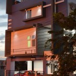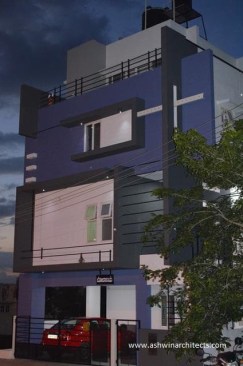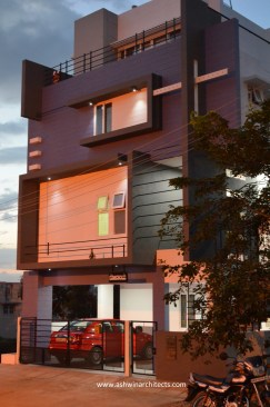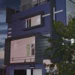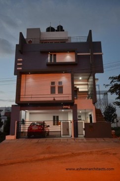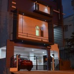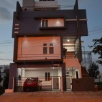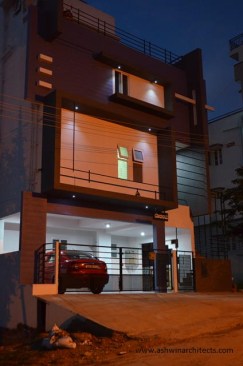 Dr. Lokesh’s residence. It is a 30’x44′ south facing site. The ground floor has a 1 BHK for rental purpose and 2 car park. The first & second floors consist of 3 BHK duplexes for Dr. Lokesh.