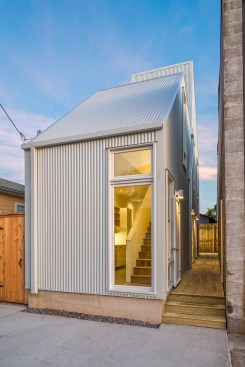The first test site for the Starter Home* thesis, 3106 St. Thomas is an undersized lot in the Irish Channel neighborhood. Technically a historic district, the Irish Channel is in fact highly diverse in the character of its built environment, filled with low-density historic housing equally as regional industrial infrastructure. According to the Starter Home* argument, the site is all at once a legal definition, an embedded history, a record of activity, and a physical entity. A Starter Home* expects no tabula rasa, and in fact relies on the specificities of site in order to function at its best, financially, urbanistically, and spatially. The overlay of zoning – both impediment and opportunity – guides the design process but also provides the potentiality of the site as Starter Home* opportunity. With this in mind, no zoning variances were sought, and in its design, 3106 seeks to take advantage of its preconditions: adjacency to a warehouse and a two-family home, a highly restricted, long and narrow footprint, and a rather generous maximum height of forty feet.