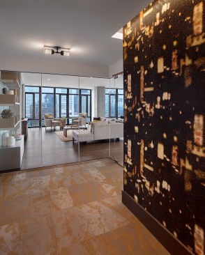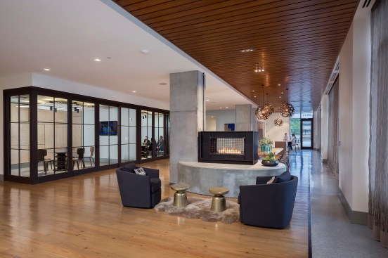 On the interior, natural materials including terrazzo floors, wood, steel and exposed concrete introduce varied textures to create visual and tactile interest and to recall the neighborhood’s industrial heritage. The wood floor in the lobby was milled from beams that were salvaged from the original warehouse on the site.