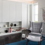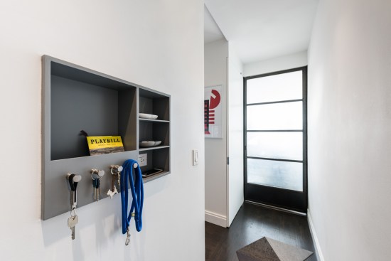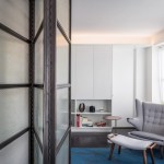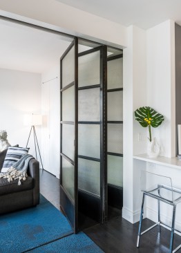 Located in a 1920s building in the East Village of Manhattan, this two-bedroom apartment generously flexes between a spacious living room and a guest bedroom. Like many prewar co-ops, the existing layout was comprised of a series of small, confined rooms, cut off from each other, restricting both natural light and air. Given that our client entertains frequently, has guests visit and often works from home, optimizing the apartment for multiple uses became critical. The apartment was reconfigured to accommodate these scenarios. A large custom 12-foot glass and blackened steel folding wall rests neatly in a niche, offering a spacious, open living space suited for entertaining. When closed, its salvaged translucent industrial glass softly glows as a second bedroom. Along the living room wall, a large shop-lacquered cabinet provides much needed storage and display. Soft LED uplighting is integrated in the cabinetry. A long kitchen island offers an informal seating and spatially connects the previously confined galley kitchen to the living room.